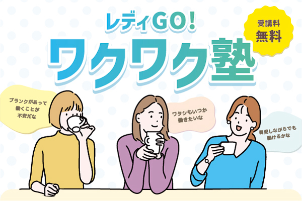 レディGO!ワクワク塾は、出産や子育てなどの理由で離職し、「いずれ働きたい」「両立できるか不安」などの思いから再就職に躊躇している女性に向けて、再就職に必要な準備や知識を習得するセミナー及びインターンシップで構成する全12回のプログラムです。企業の皆様には、受講者に向けて仕事や職場の様子についてご紹介いただくとともに、交流を通じて理解を深めていただく機会にご参加いただけます。また、1~3日間(3時間程度/日)の職場体験会にもご参加いただけます。