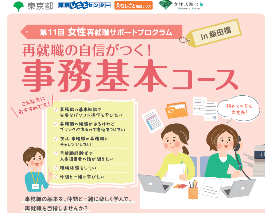 「事務職の経験はあるけれど、ブランクがあるので自信をつけたい」「事務職は未経験だけど、次は事務の仕事にチャレンジしたい」という方におすすめのコースです。事務職の基本を学んで、再就職を目指しませんか?